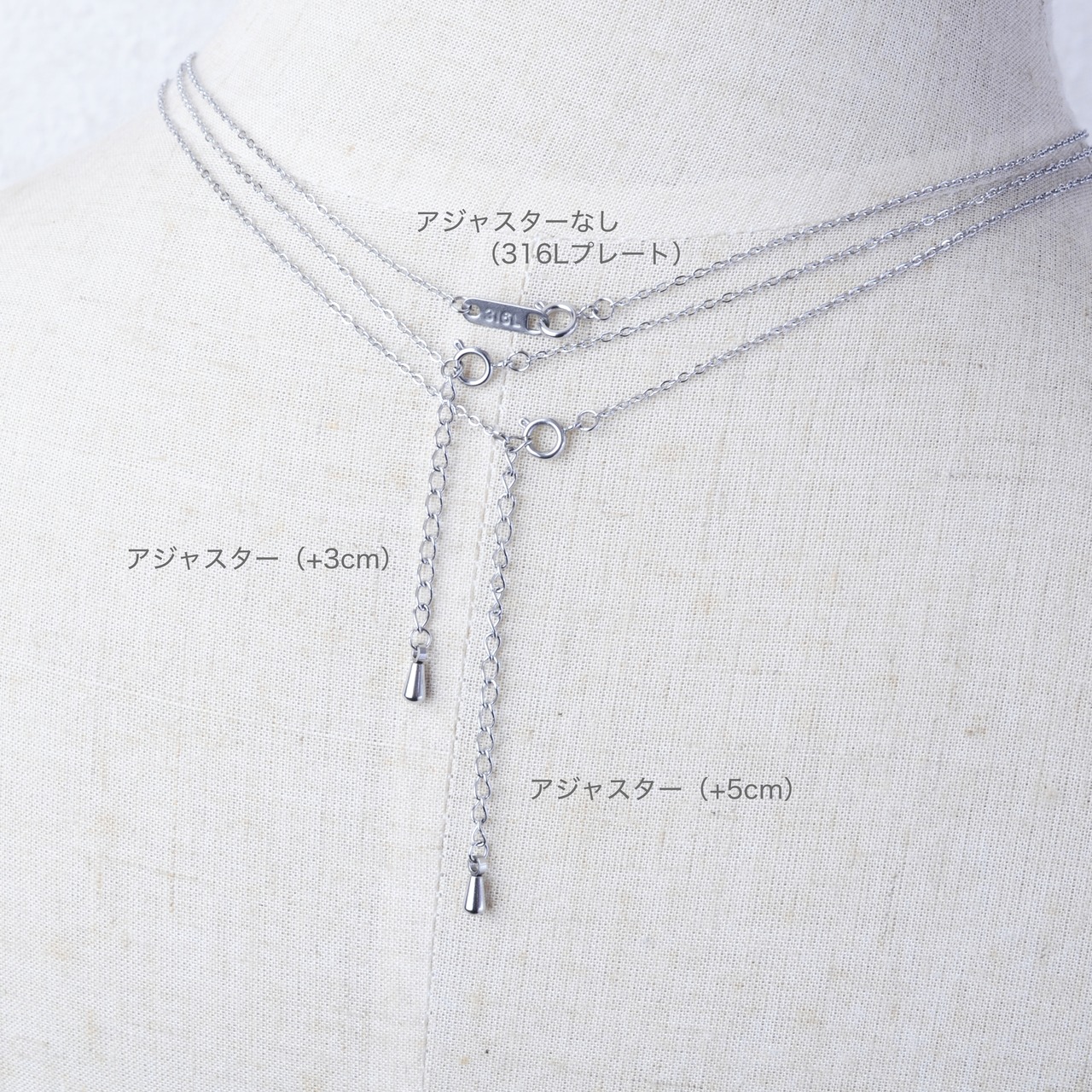 ネックレスチェーン、アジャスターなど全ての金属パーツが安心のサージカルステンレスSUS316L製です。
