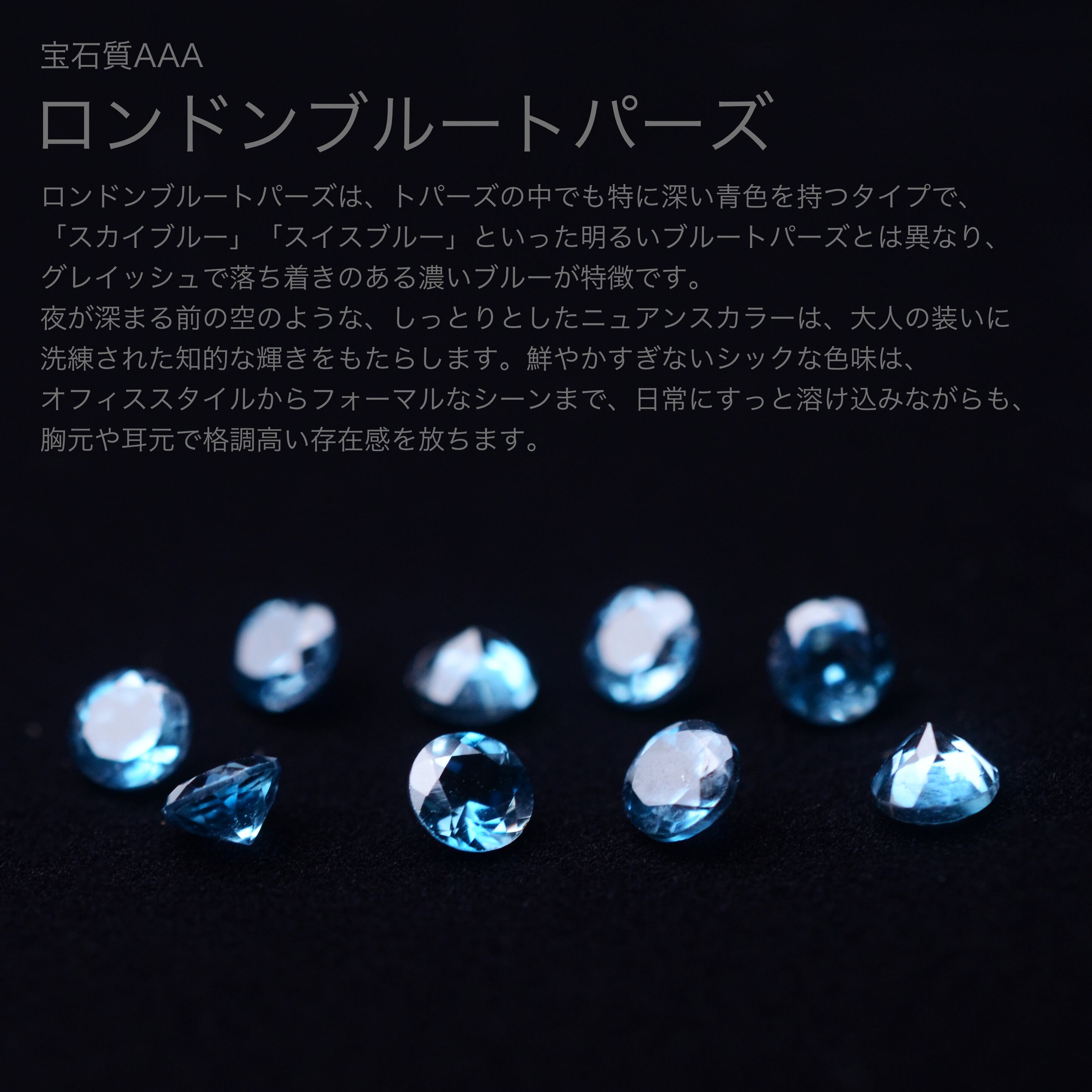 トパーズの中でも特に深い青色を持つタイプで、「スカイブルー」「スイスブルー」といった明るいブルートパーズとは異なり、グレイッシュで落ち着きのある濃いブルーが特徴です。夜が深まる前の空のような、しっとりとしたニュアンスカラーは、大人の装いに洗練された知的な輝きをもたらします。